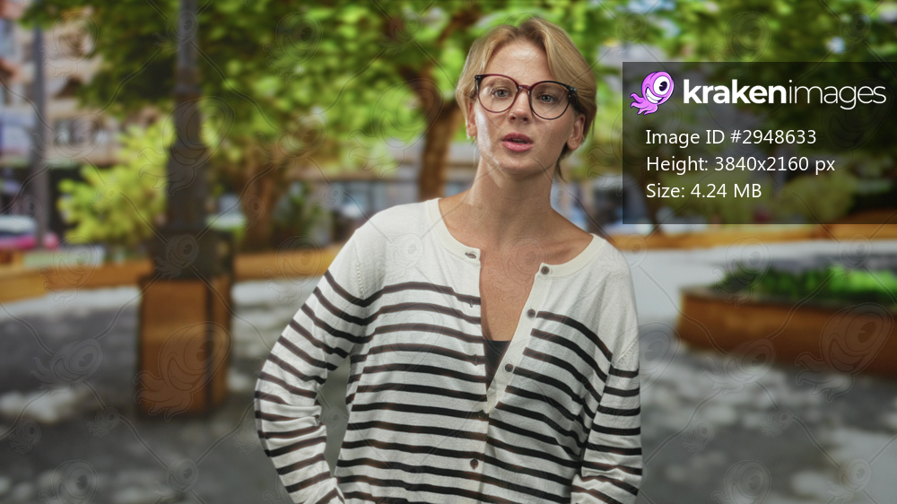 Woman wearing glasses and striped cardigan with arms crossed in urban street plaza by benches and lampposts; quiet confidence.