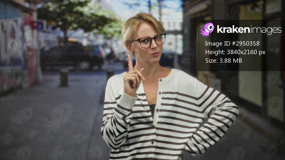 Woman wearing glasses and striped cardigan points index finger upward with other hand on hip on an urban shopping street with parked cars and graffiti; thoughtful curiosity. - Kraken Images