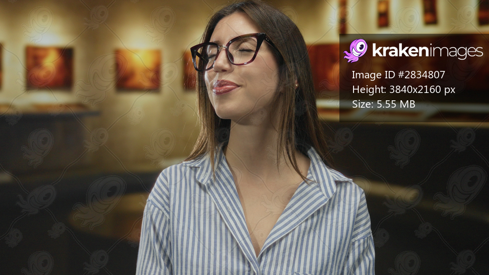 Woman wearing glasses and striped shirt closes eyes in museum gallery while viewing abstract painting; serenity reflection admiration.