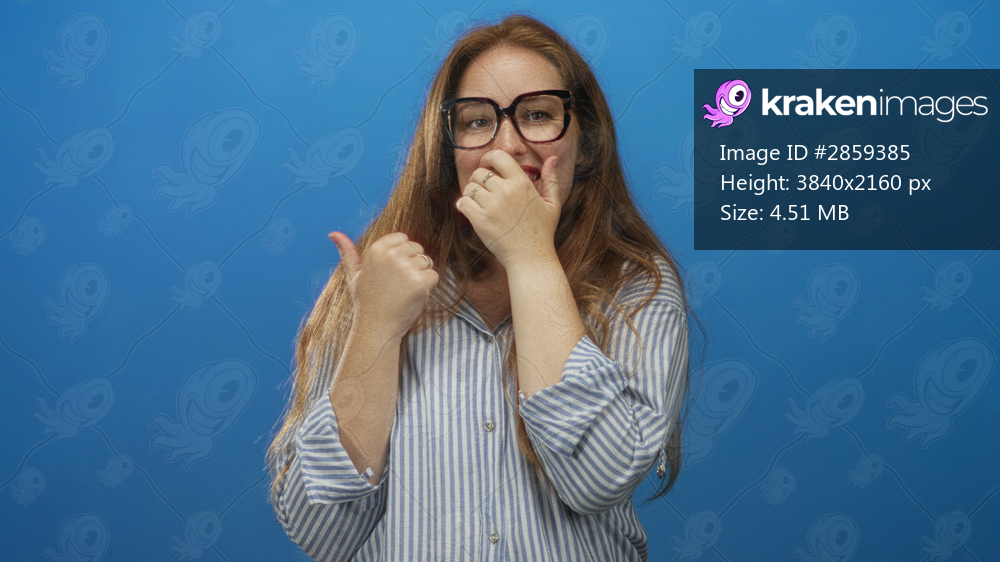Woman wearing glasses and striped shirt finger to lips for silence while pointing thumb over shoulder in studio; playful secrecy.
