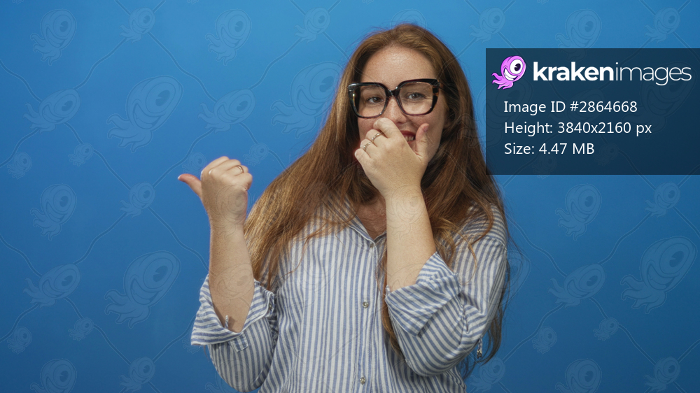 Woman wearing glasses and striped shirt finger to lips for silence while pointing thumb over shoulder in studio; playful secrecy.