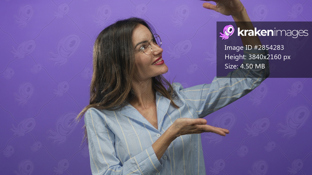 Woman wearing glasses and striped shirt framing an invisible object with open hands in a purple studio; optimism.