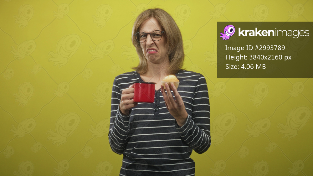 Woman wearing glasses and striped shirt holding red mug and muffin, grimacing with wrinkled nose in a studio; disgust hesitation.