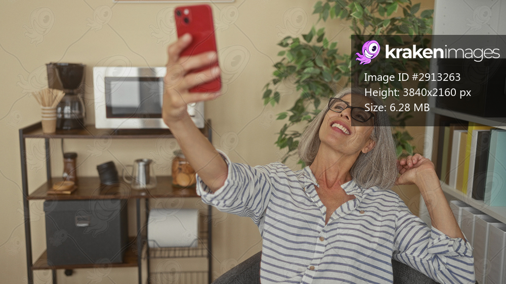 Woman wearing glasses and striped shirt holding red smartphone with arm outstretched taking selfie in office chair near bookshelf; happiness connection relaxation. - Kraken Images