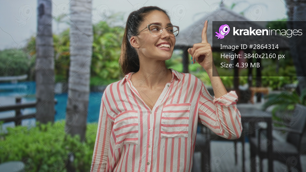 Woman wearing glasses and striped shirt pointing finger at building near pool at resort by palm trees; inspiration optimism.