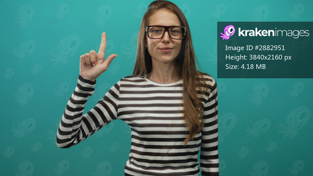 Woman wearing glasses and striped shirt points thumb to chest in teal studio; confidence empowerment success.