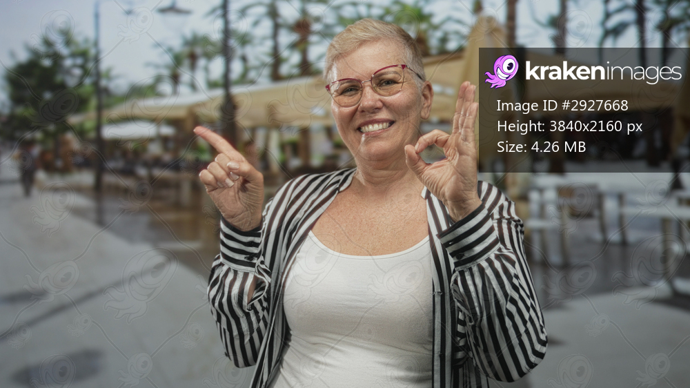 Woman wearing glasses and striped shirt smiling and points finger while making ok sign with hand at street restaurant terrace; approval.