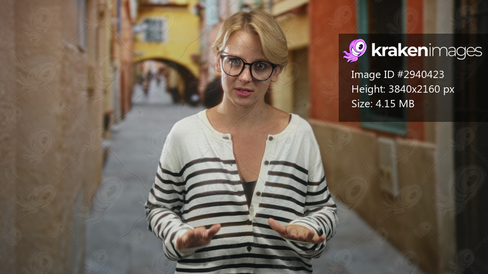 Woman wearing glasses and striped sweater shows open palms forward and flat hands facing up in a narrow cobblestone street with an archway; calm reassurance. - Kraken Images