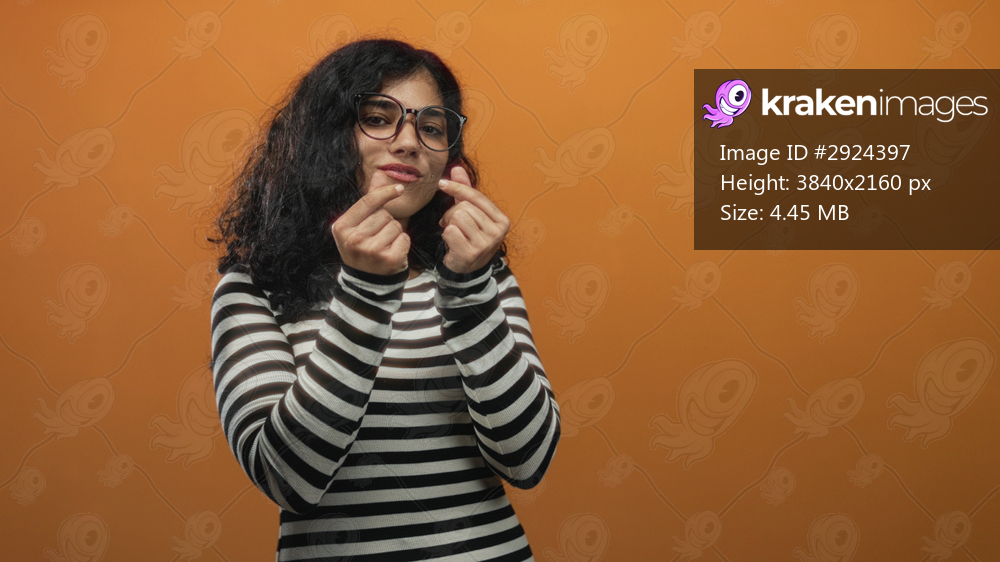Woman wearing glasses and striped top shows peace sign and finger heart with her hands in an orange studio; playful confidence.