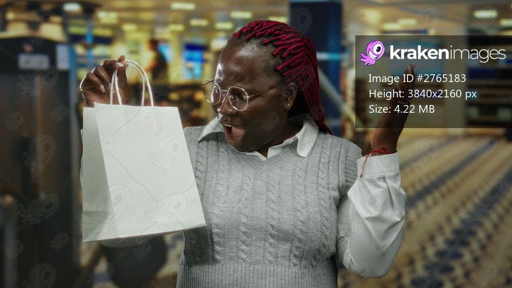 Woman wearing glasses and sweater excitedly holds shopping bag indoors with blurred background suggesting a modern store or mall environment.