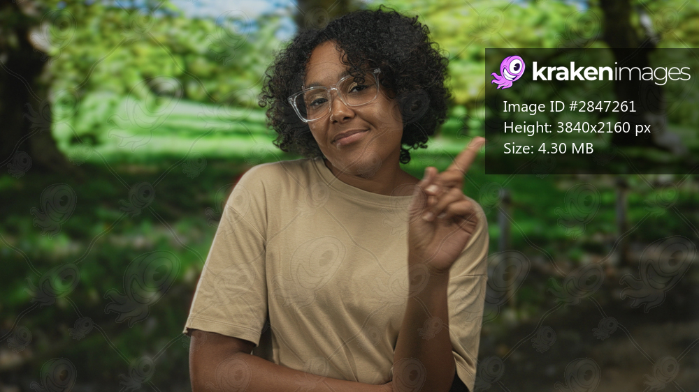 Woman wearing glasses tilts head and points finger to object near lush green trees in park; confidence insight clarity.