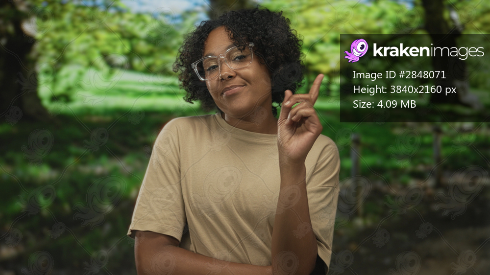 Woman wearing glasses tilts head and points finger to object near lush green trees in park; confidence insight clarity.