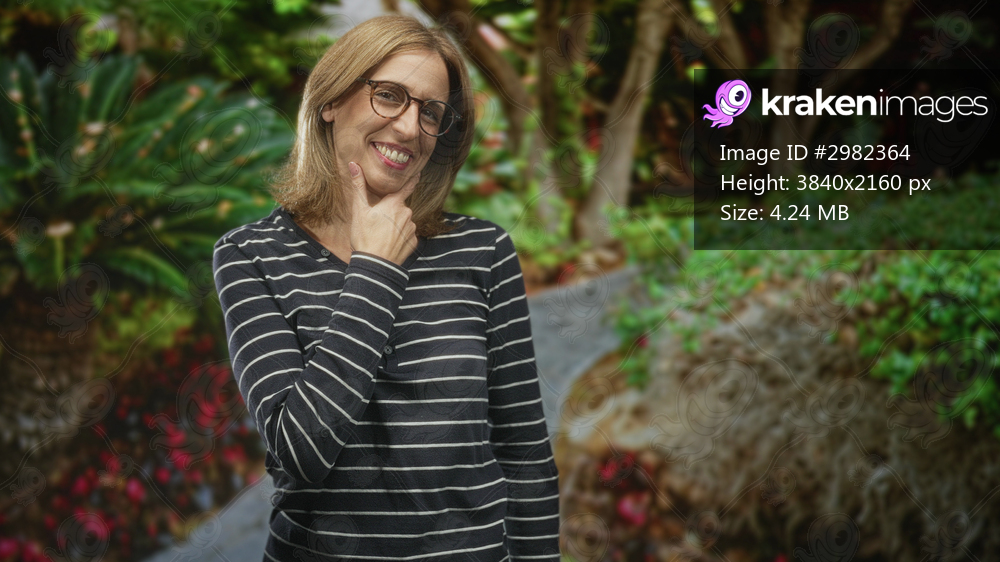 Woman wearing glasses touches her chin with one hand while smiling on street pathway lined with plants; thoughtful reflection.