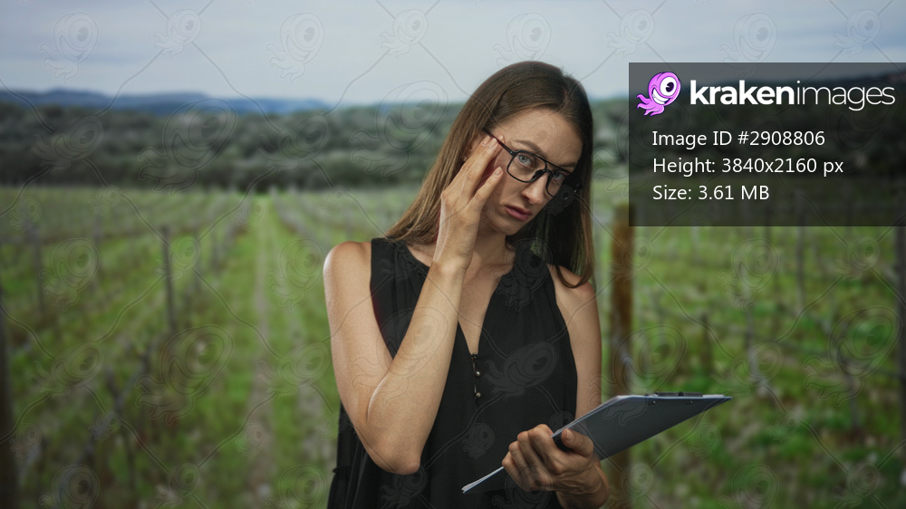 Woman wearing glasses touches her temple and reads a clipboard among vineyard rows in a field; planning contemplation.