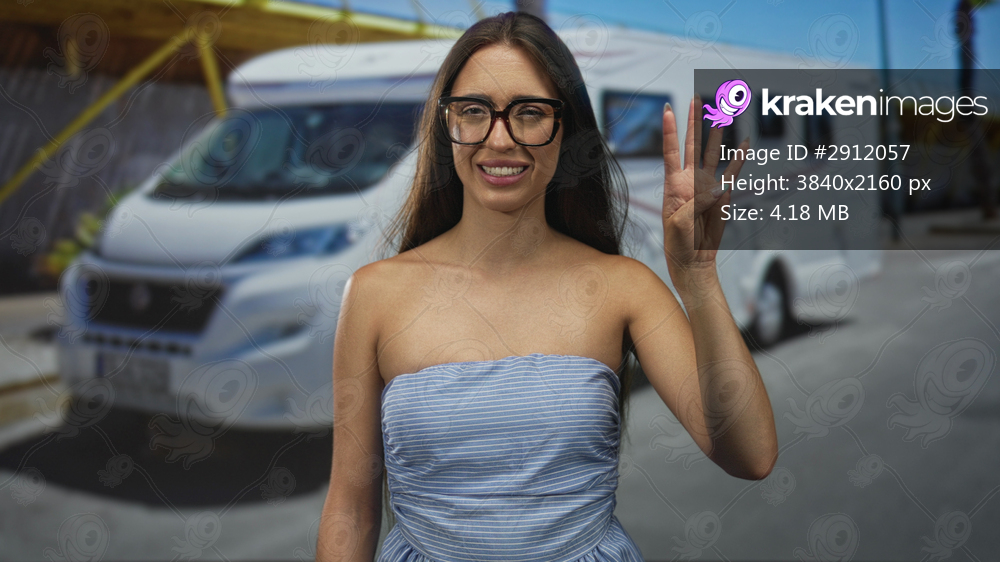 Woman wearing glasses waves hand beside a white camper on a street in sunlight; travel optimism cheerful.