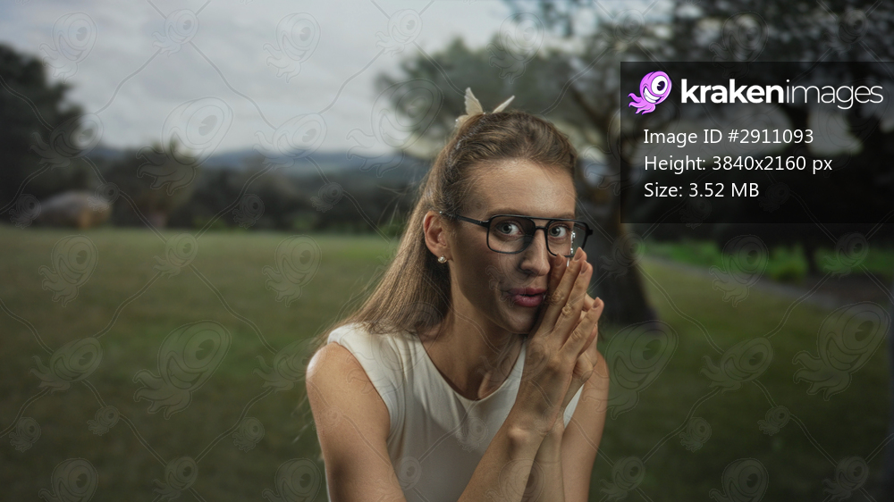 Woman wearing glasses whispering with hands cupped to mouth in a park field by trees under cloudy sky; secrecy.