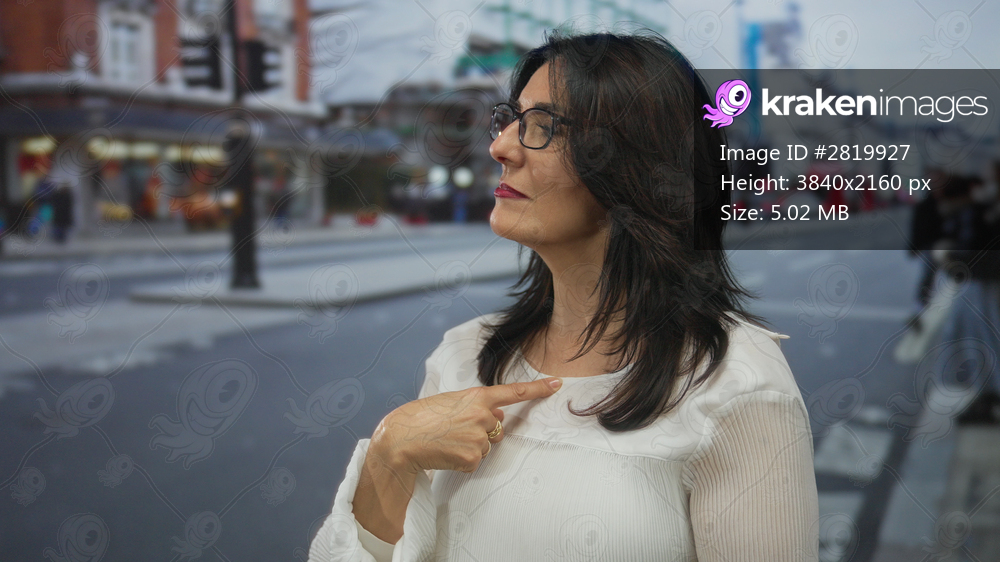Woman wearing glasses and white blouse points finger to chest on busy urban street; identity assertion confidence.