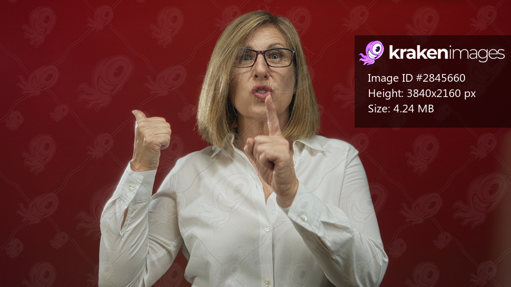 Woman wearing glasses and white blouse shows thumbs up and presses finger to lips for silence in a bright red studio setting; hush.