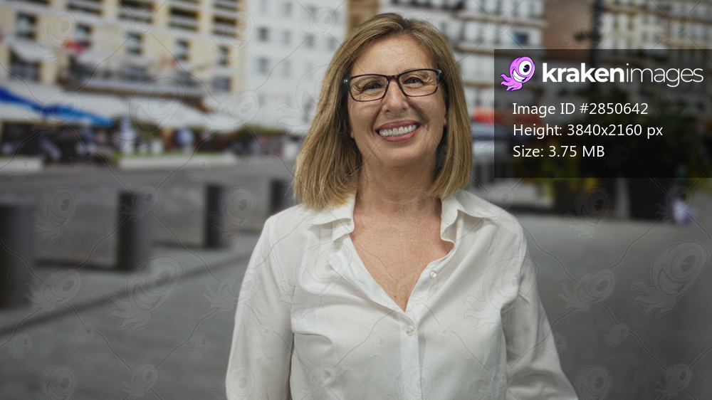 Woman wearing glasses and white blouse smiling broadly on street lined with building facades and cafe terraces; happiness.