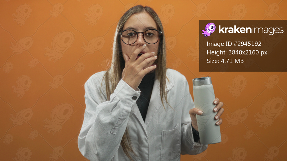 Woman wearing glasses and white coat holding travel mug with hand to mouth in studio; surprise curiosity.