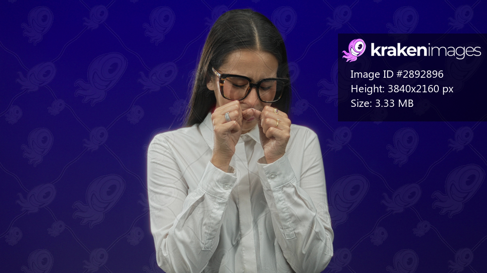 Woman wearing glasses and white shirt covering face with hands and closed eyes in blue studio; sadness solitude.