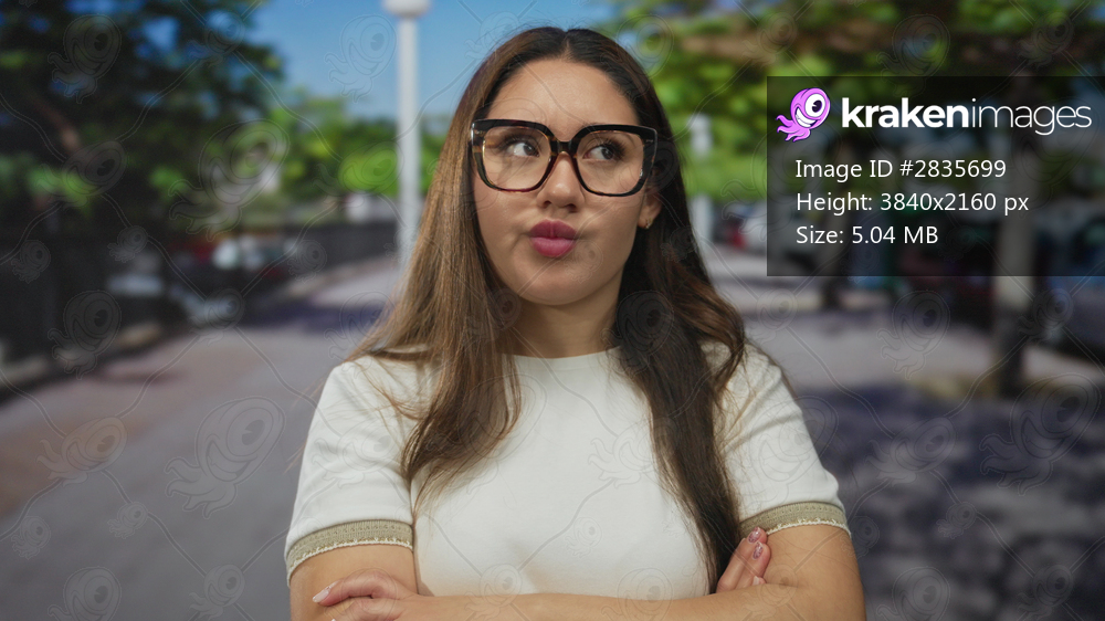 Woman wearing glasses and white shirt crosses arms on street amid parked cars and trees; rejection.