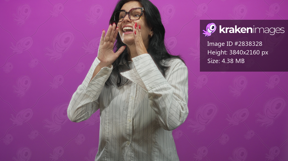 Woman wearing glasses and white shirt cupping hands near mouth while gesturing in purple studio; communication enthusiasm.
