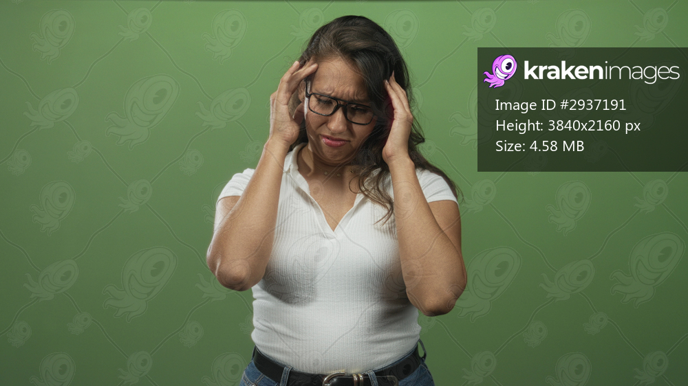 Woman wearing glasses and white shirt holding head with hands in green studio; stress headache health.