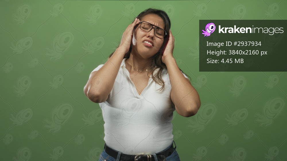 Woman wearing glasses and white shirt holding head with hands in green studio; stress headache health.