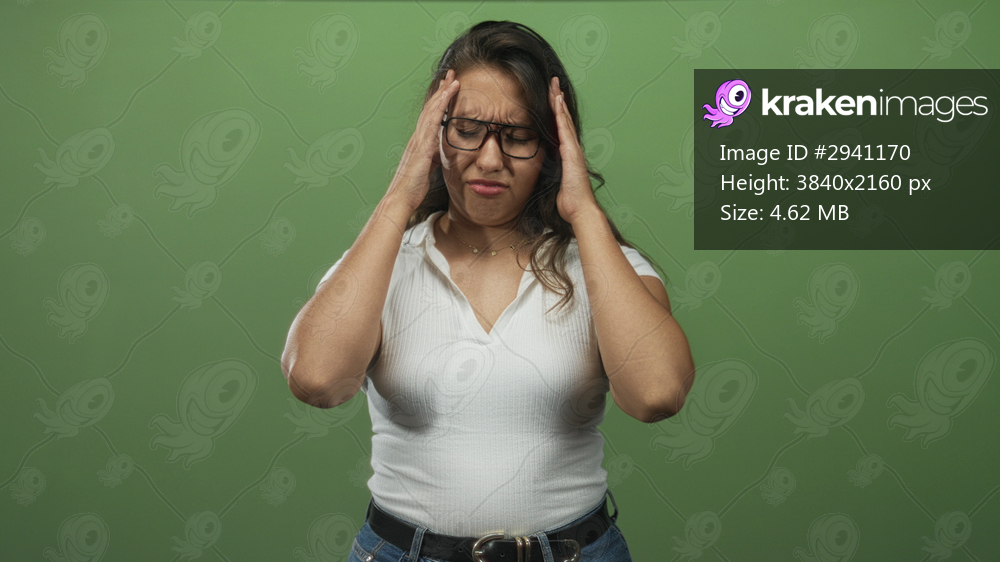 Woman wearing glasses and white shirt holding head with hands in green studio; stress headache health.