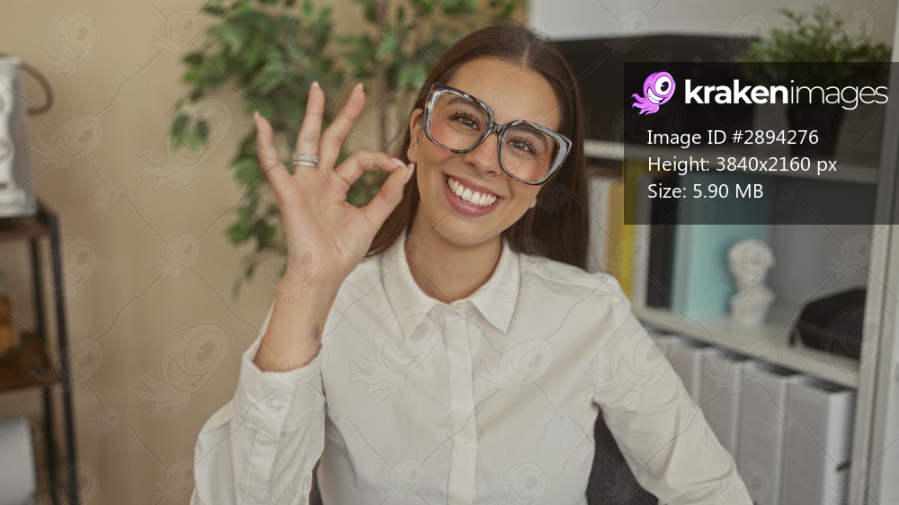 Woman wearing glasses and white shirt makes ok sign with hand near face in office building; friendly confident happiness.