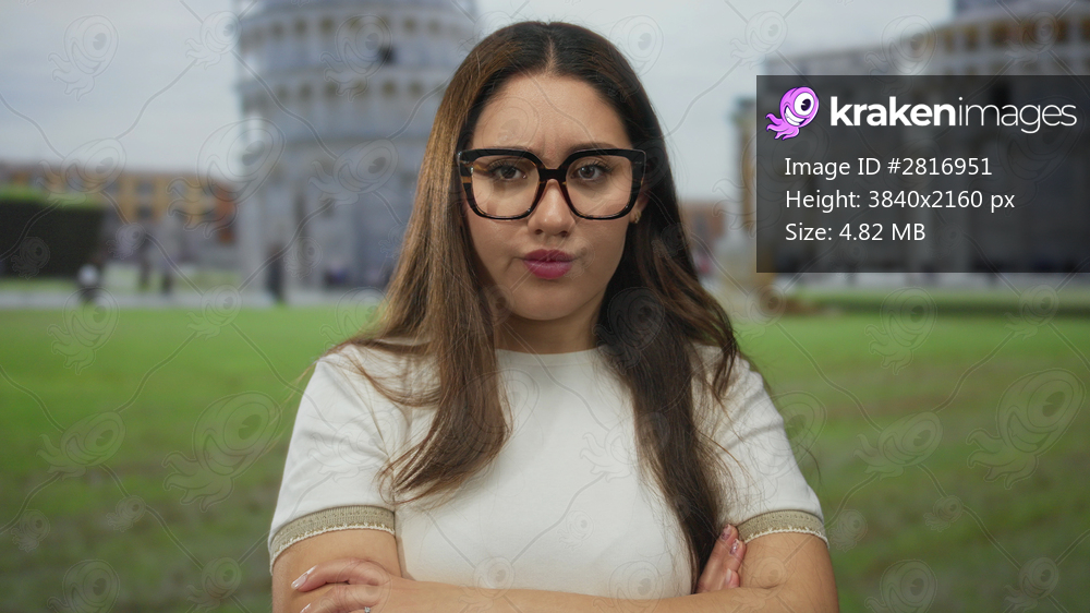 Woman wearing glasses and white shirt pouts lips in front of pisa tower building under cloudy sky; boredom.