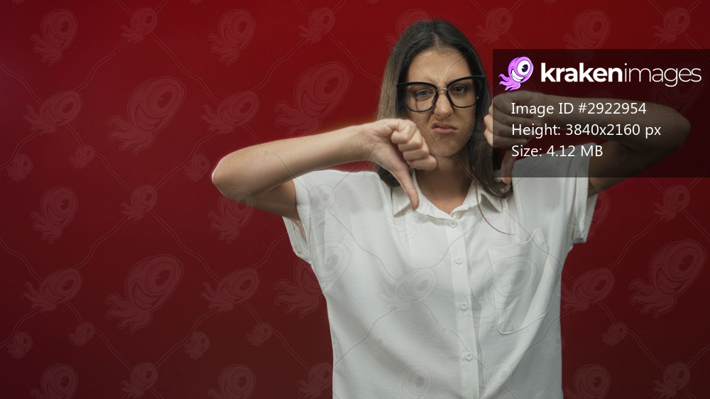 Woman wearing glasses and white shirt showing thumbs down gesture and frown in red studio; disapproval rejection.
