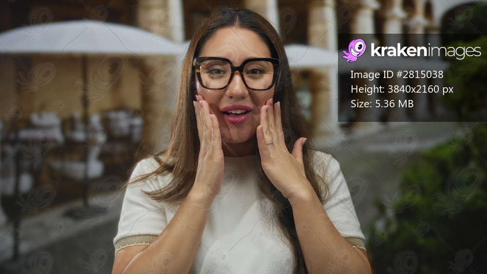 Woman wearing glasses and white shirt smiles and speaks softly on restaurant terrace in warm evening light; serenity.