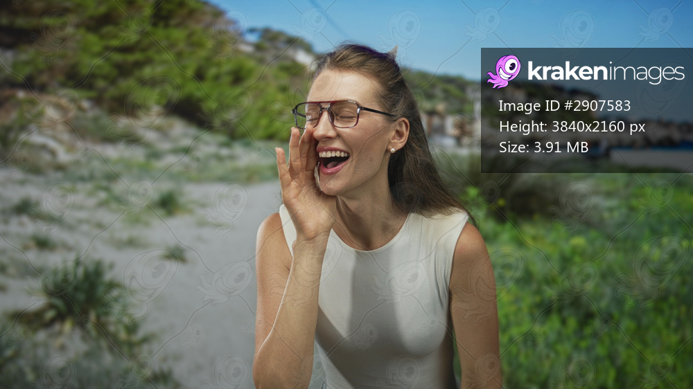 Woman wearing glasses and white sleeveless top cupping hands to mouth calling out in forest park setting; playful joy.