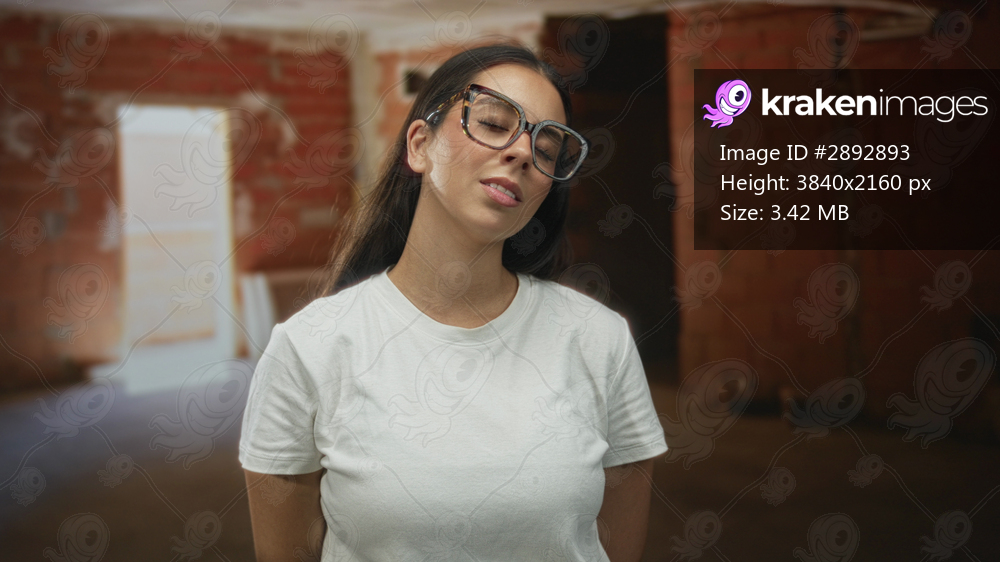 Woman wearing glasses and white t shirt with hand raised near face, eyes closed, standing in unfinished brick building interior; serenity.