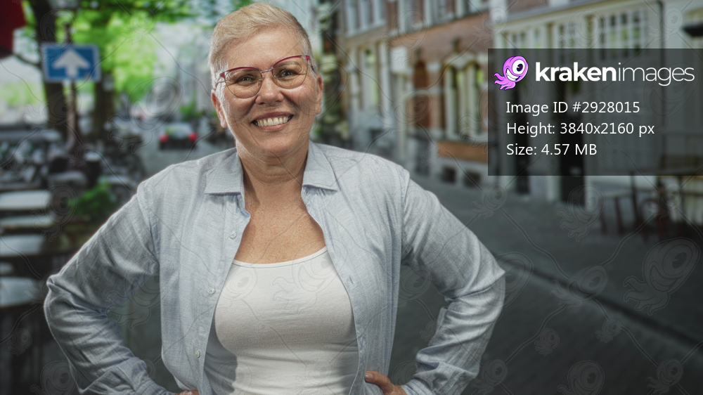 Woman wearing glasses and white tank top, smiling with hands on hips on a city street lined with cafes, tables and bicycles; confidence independence.
