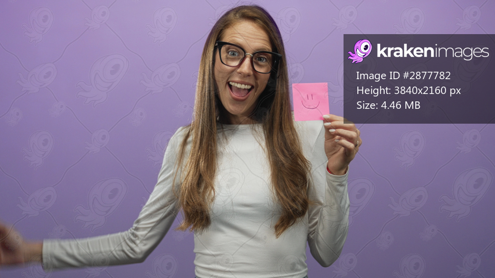 Woman wearing glasses and white top holding a pink sticky note and pointing finger to it in studio with purple backdrop; happiness optimism.
