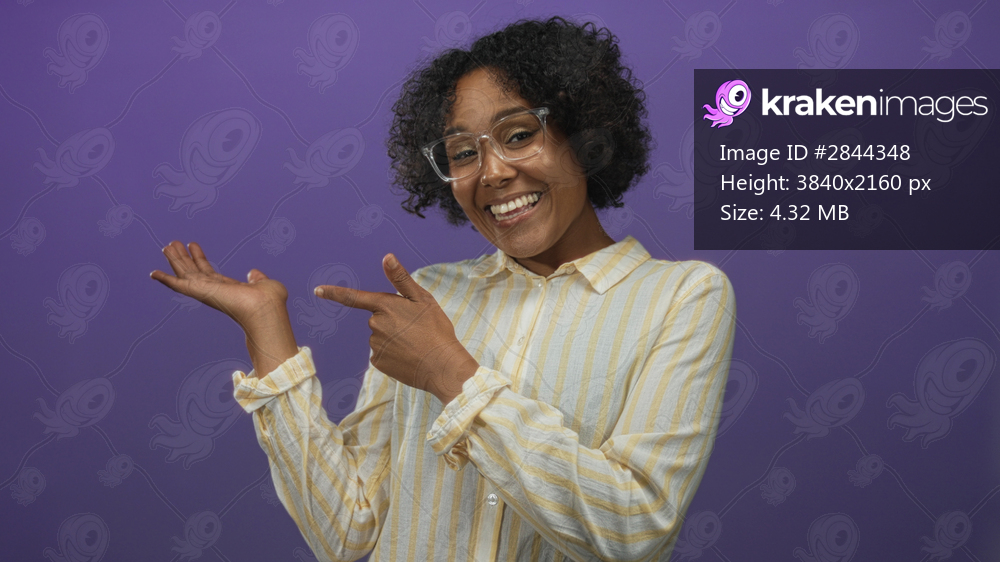 Woman wearing glasses and yellow striped shirt pointing finger to palm while smiling in purple studio; confidence.