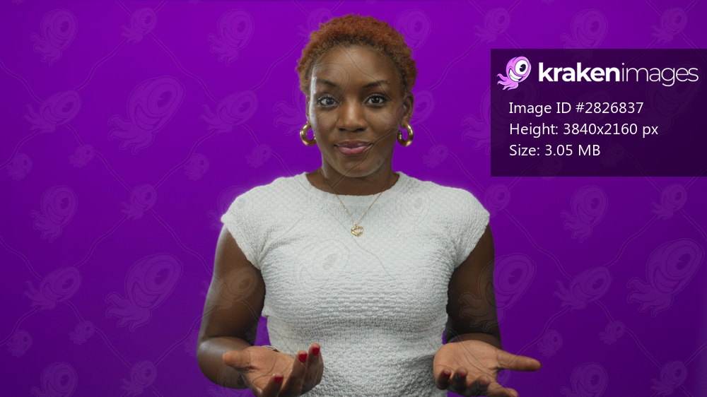 Woman wearing gold hoop earrings covering mouth with hands and wide eyes in purple studio; surprise.