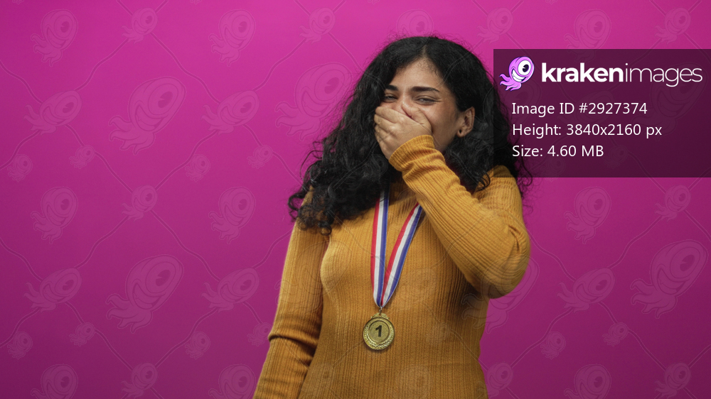 Woman wearing gold medal covers mouth with hand in pink studio, curly hair and mustard sweater; surprise.