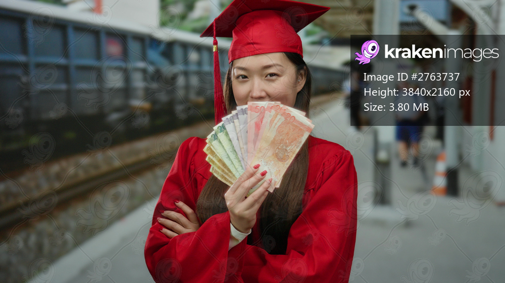 Woman wearing graduation cap holding various banknotes from philippines standing at train station outdoors smiling confidently.