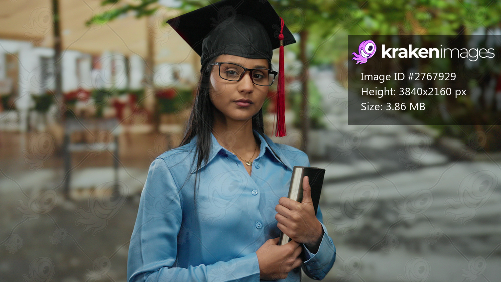 Woman wearing graduation cap stands confidently outdoors on a sunny street, holding a book, representing academic achievement and success.