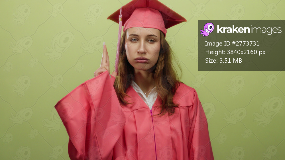 Woman wearing graduation gown stands isolated against yellow background looking tired and unmotivated after finishing her studies capturing the essence of student life fatigue. - Kraken Images