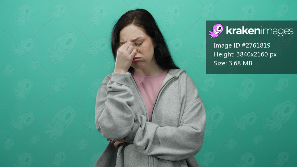 Woman wearing gray hoodie with brunette hair standing against a green background expressing frustration by pinching nose in a thoughtful manner.