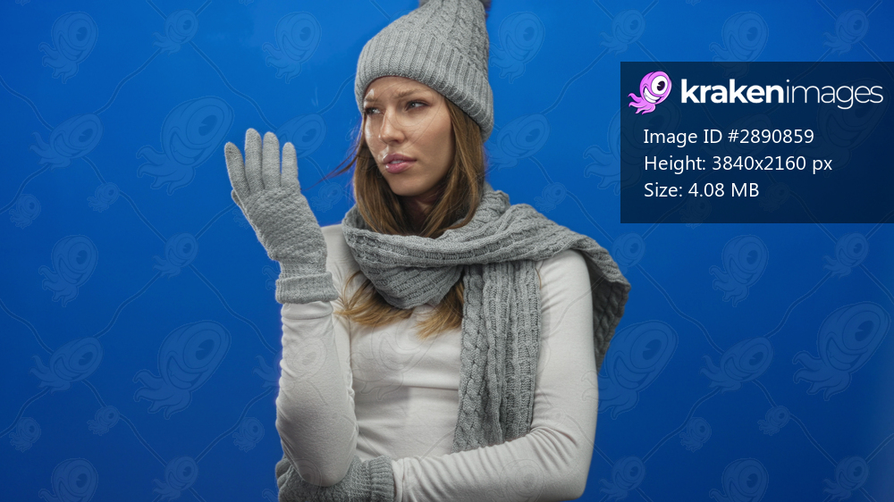 Woman wearing gray knit hat, scarf and gloves holding gloved hand to temple in blue studio; winter chill confusion.