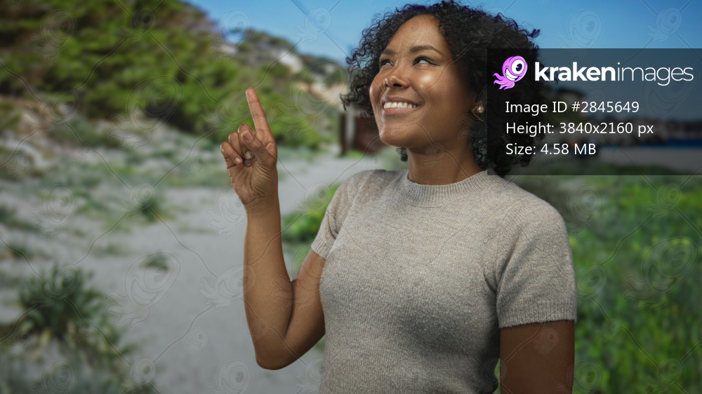 Woman wearing gray top points finger toward distant waterline among coastal trees in forest setting; serenity.