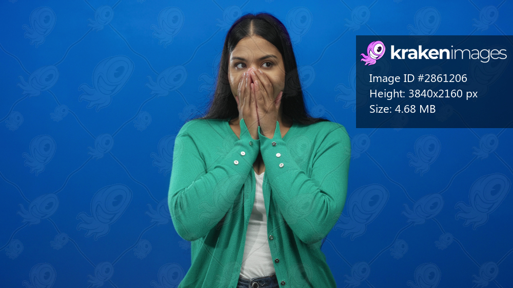 Woman wearing green cardigan covers mouth with both hands fully and closes eyes in blue studio; surprise.