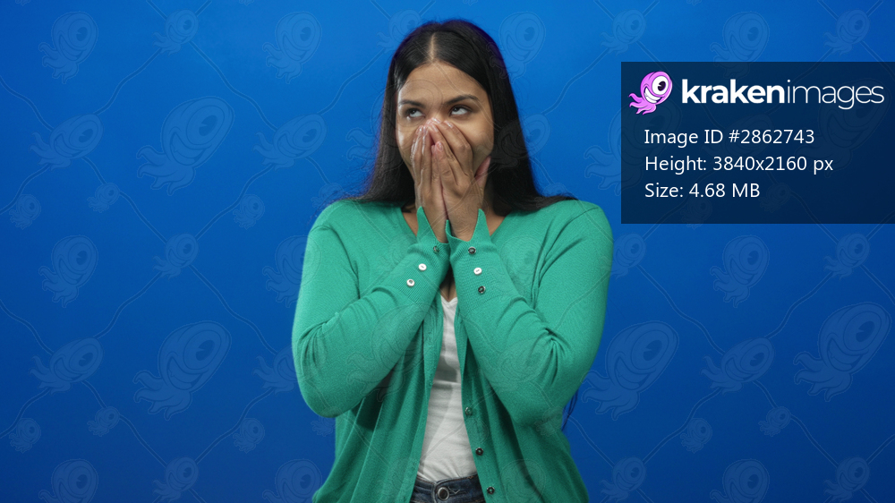 Woman wearing green cardigan covers mouth with both hands fully and closes eyes in blue studio; surprise.