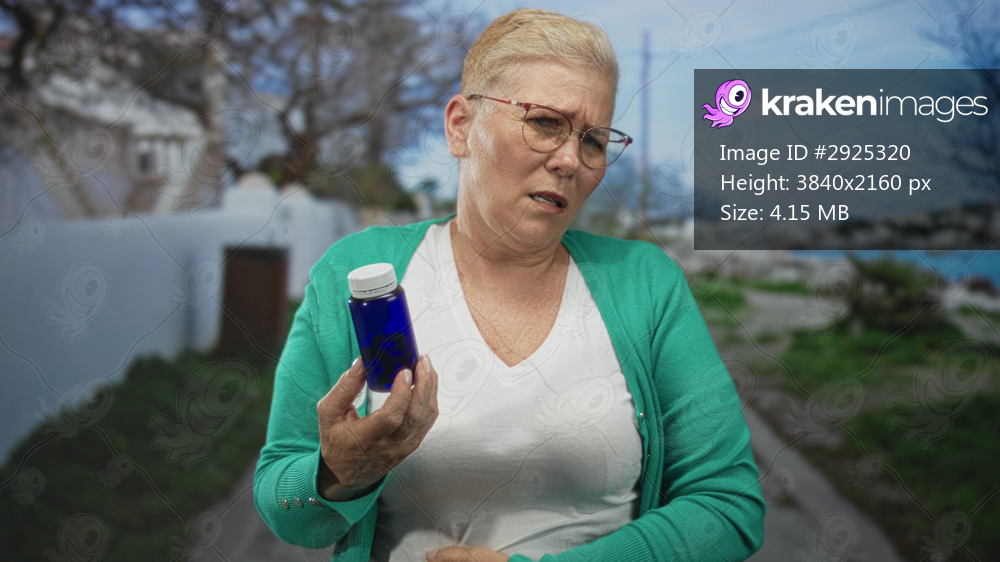 Woman wearing green cardigan and glasses holding blue bottle and clutching stomach on street; stomachache concern.